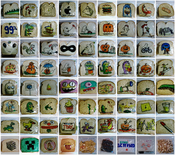 The graphic designer David Laferriere has been decorating his kids’ sandwich bags with Sharpie drawings since 2008, photographing each adorable creation and posting over 1,100 of them on his Flickr page. Popular subjects include monsters, Halloween, and non-sandwich foods, but Laferriere has also incorporated Doctor Who‘s TARDIS and even the works of Picasso into his repertoire.